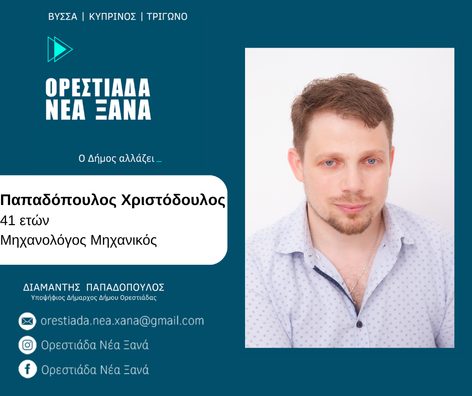 Δυο νέα πρόσωπα που θα πλαισιώσουν το ψηφοδέλτιο της παρουσίασε σήμερα η παράταξη “Ορεστιάδα Νέα Ξανά” του υποψήφιου Δημάρχου Διαμαντή Παπαδόπουλου.