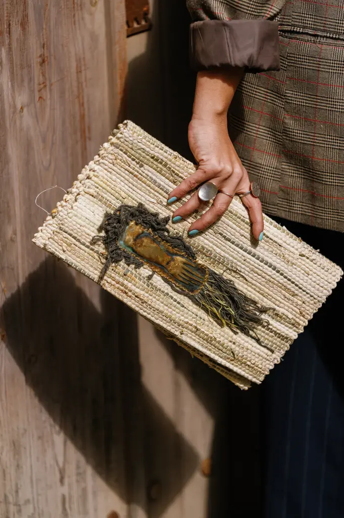 Την τσάντα-φάκελο με τα φυσικά «νερά» την ύφανε η Bedicha από την ορεινή Ξάνθη, ενώ τα ευέλικτα σουπλά είναι έργο της Ζωγραφούλας από τον Βόρειο Έβρο. Δουλεμένα στο χέρι, αμφότερα μοιράζονται κάτι κοινό: είναι φτιαγμένα από φύλλα καλαμποκιού, τη νέα πρώτη ύλη με την οποία καταπιάνεται μια ομάδα γυναικών για την παραγωγή χειροποίητων δημιουργιών υπό το βλέμμα, την προτροπή και την καθοδήγηση της πάντα δυναμικής Αγγελικής Γιαννακίδου, ιδρύτριας και γενικής διευθύντριας του Εθνολογικού Μουσείου Θράκης, στη Αλεξανδρούπολη.