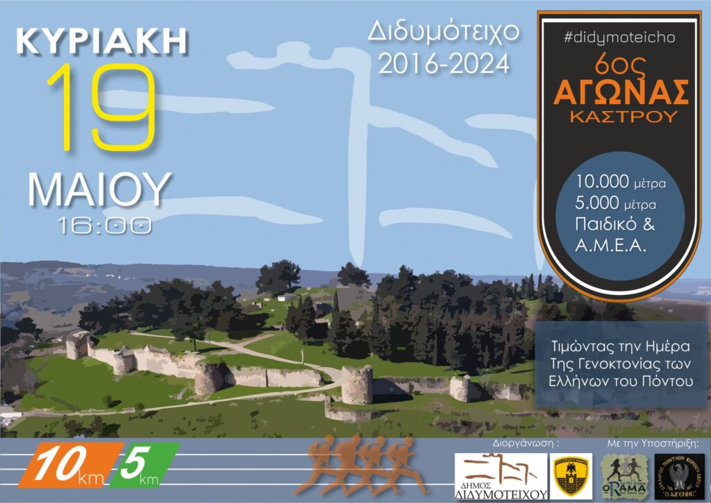 Ο Δήµος Διδυµοτείχου τιμώντας την ημέρα Γενοκτονίας των Ελλήνων του Πόντου σας προσκαλεί να συµµετάσχετε στον « 6ο ΑΓΩΝΑ ΔΡΟΜΟΥ ΚΑΣΤΡΟΥ ΔΙΔΥΜΟΤΕΙΧΟΥ» που θα διεξαχθεί την Κυριακή 19 Μαΐου 2024, εντός της πόλης του Διδυµοτείχου από τις 16:00 και έπειτα.
