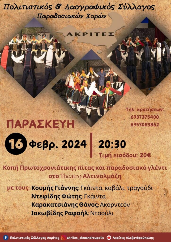 Ο Πολιτιστικός & Λαογραφικός Σύλλογος Παραδοσιακών Χορών ΑΚΡΙΤΕΣ, σας καλεί να διασκεδάσετε και να χορέψετε όλοι μαζί παρέα, την Παρασκευή 16 Φεβρουαρίου στην αίθουσα του πάρκου Αλτιναλμάζη στην Αλεξανδρούπολη.
