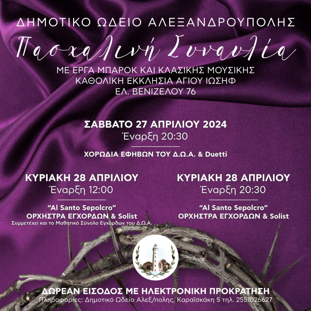 Το εκπαιδευτικό προσωπικό και οι σπουδαστές του Δημοτικού Ωδείου Αλεξανδρούπολης για άλλη μια χρονιά θα είναι παρόντες στον Καθολικό Ναό Αγίου Ιωσήφ παραμονές της Μεγάλης Εβδομάδας του Πάσχα.