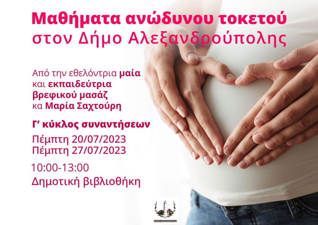 Ο Δήμος Αλεξανδρούπολης σε συνεργασία με το Γραφείο Εθελοντισμού διοργανώνουν μαθήματα ανώδυνου τοκετού από την εθελόντρια μαία και εκπαιδεύτρια βρεφικού μασάζ κα Μαρία Σαχτούρη.