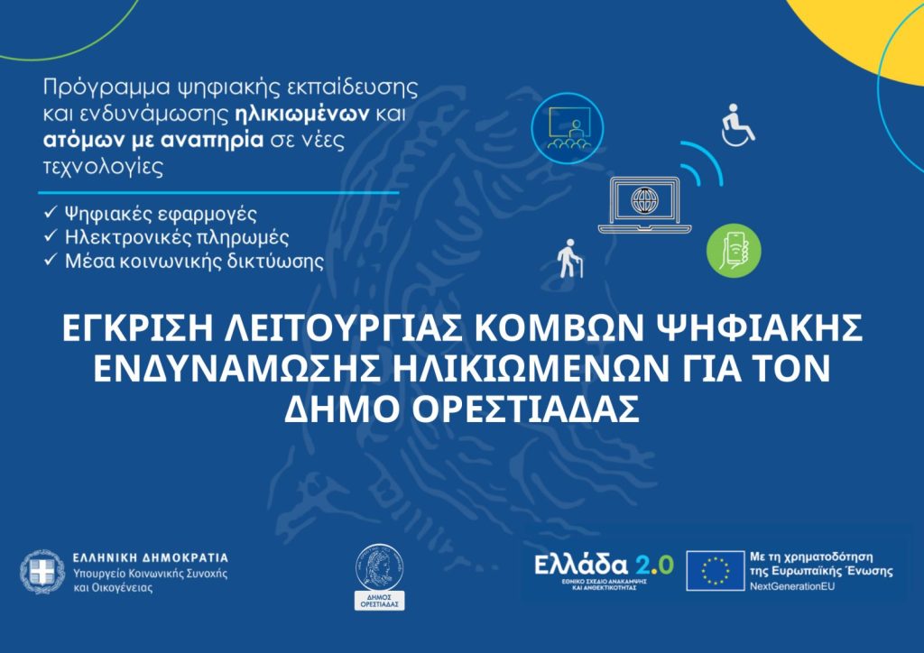Με την έγκριση λειτουργίας Κόμβου Ψηφιακής Ενδυνάμωσης Ηλικιωμένων στον Δήμο Ορεστιάδας, δίνεται η δυνατότητα σε συμπολίτες μας μεγαλύτερης ηλικίας, καθώς και σε άτομα με αναπηρία, να αποκτήσουν ουσιαστική πρόσβαση στις ψηφιακές υπηρεσίες και στη σύγχρονη καθημερινότητα. Η ψηφιακή εποχή δεν