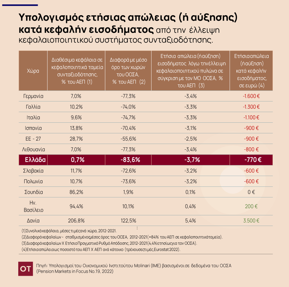 Εάν ο κεφαλαιοποιητικός πυλώνας στο συνταξιοδοτικό σύστημα της Ελλάδας ήταν εξίσου αναπτυγμένος όπως στις υπόλοιπες χώρες του ΟΟΣΑ, η ετήσια απόδοσή του, σύμφωνα με συντηρητικές εκτιμήσεις, θα αντιστοιχούσε σε περίπου 3% του ΑΕΠ. Αυτή η απώλεια μεταφράζεται σε απώλεια κατά κεφαλήν εισοδήματος 770 ευρώ ετησίως, εξαιτίας της αναιμικής ανάπτυξης του κεφαλαιοποιητικού πυλώνα την τελευταία δεκαετία.