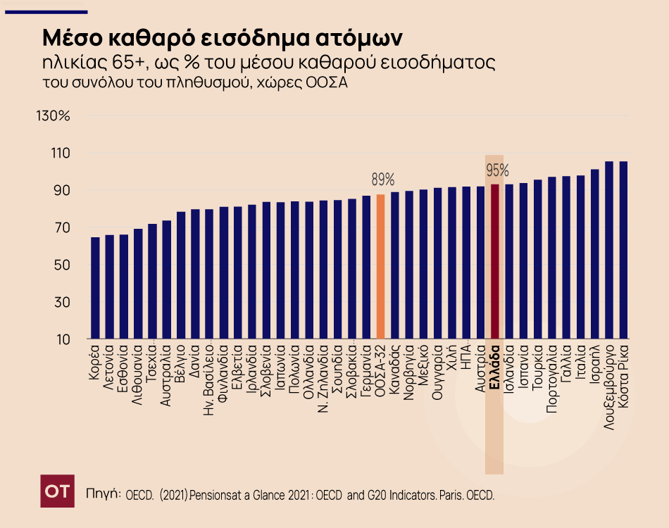 Οι πολίτες άνω των 65 ετών στην Ελλάδα έχουν μέσο καθαρό εισόδημα που αντιστοιχεί στο 95% του μέσου καθαρού εισοδήματος του συνόλου του πληθυσμού. Ο αντίστοιχος μέσος όρος των χωρών του ΟΟΣΑ είναι στο 89%.