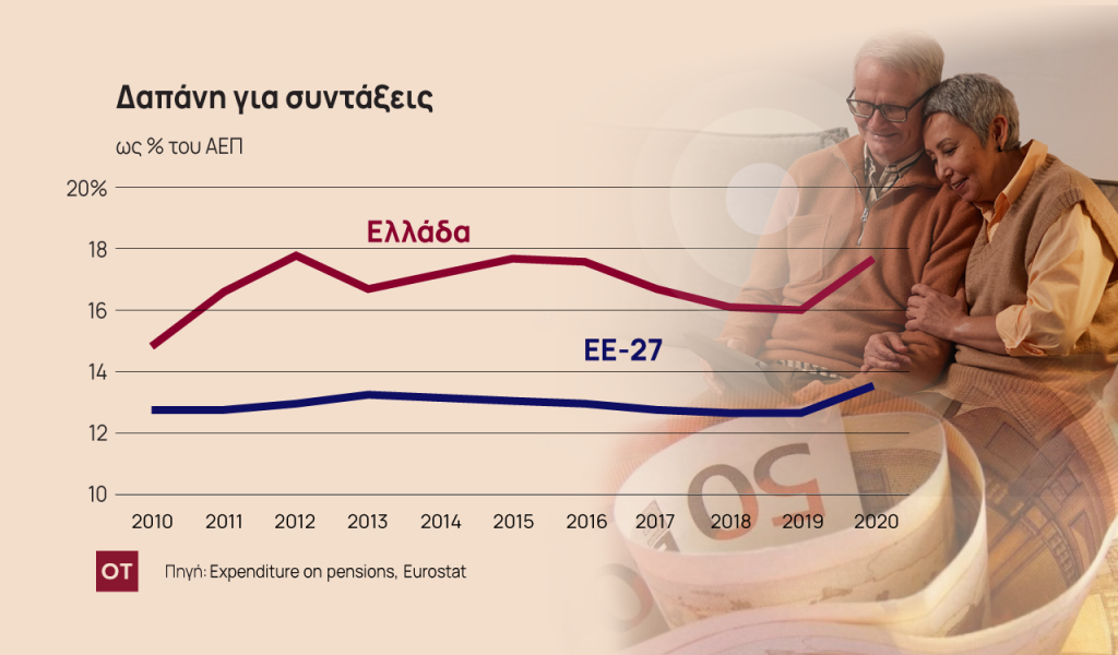 Παρά τις πολλαπλές αλλαγές του συνταξιοδοτικού συστήματος μέσω νομοθέτησης, η Ελλάδα διατηρεί τη μεγαλύτερη δαπάνη ως ποσοστό του ΑΕΠ για συντάξεις ανάμεσα στις 27 χώρες της ΕΕ.