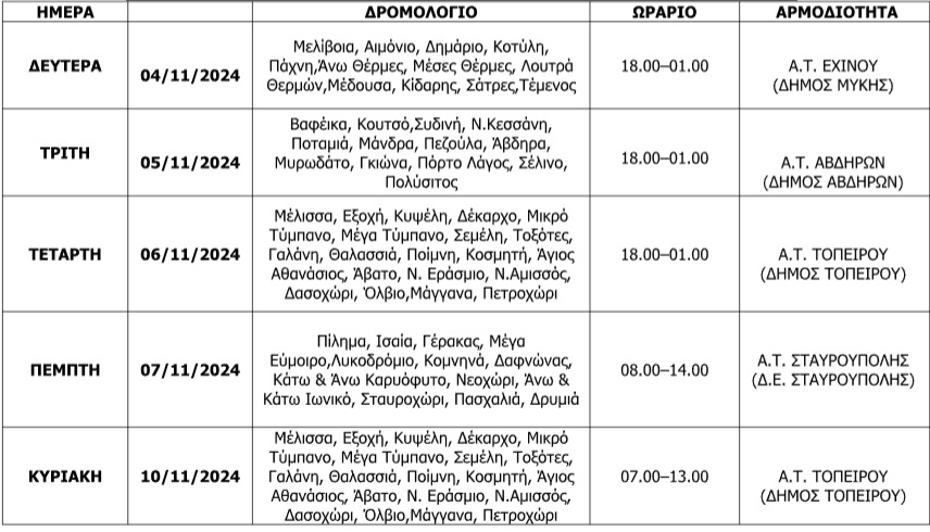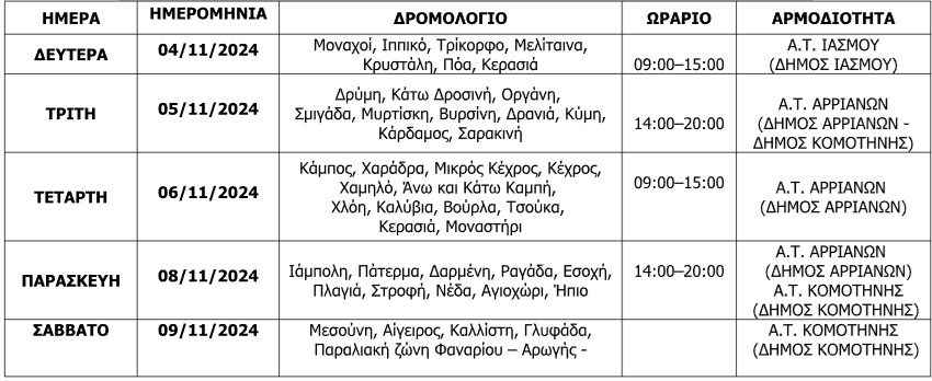 Ανακοινώνεται ότι για την επόμενη εβδομάδα τα δρομολόγια των Κινητών Αστυνομικών Μονάδων της Γενικής Περιφερειακής Αστυνομικής Διεύθυνσης Ανατολικής Μακεδονίας και Θράκης από 4 έως και 11 Νοεμβρίου του έτους 2024 θα είναι τα ακόλουθα: