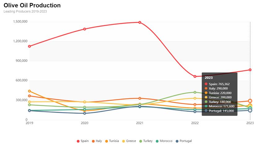 Συνδυαστικά, η Ισπανία, η Ιταλία, η Τυνησία, η Ελλάδα, η Τουρκία, το Μαρόκο και η Πορτογαλία ήταν υπεύθυνες για το 72% της παγκόσμιας παραγωγής ελαιολάδου πέρυσι. Κατά τα τελευταία τέσσερα καλλιεργητικά έτη, το ποσοστό αυτό ανέρχεται στο 82%.