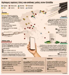 Σ αυτές κυρίαρχο ρόλο παίζουν οι περίφημες σπάνιες γαίες δηλαδή τα 17 μεταλλικά στοιχεία τα οποία έχουν ηγεμονικό ρόλο στο σύγχρονο μεταβαλλόμενο κόσμο, αφού είναι η δομική πρώτη ύλη στην διαδικασία παραγωγής ευρύτατου φάσματος προϊόντων υψηλής τεχνολογίας (υπολογιστές, οθόνες τηλεοράσεων, smartphones, καταλύτες, μπαταρίες, οπτικές ίνες, αμυντικοί εξοπλισμοί, δορυφόροι).