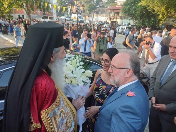 Η υποδοχή της εικόνας, του Μητροπολίτη Πειραιώς κ. Σεραφείμ και της συνοδείας του πραγματοποιήθηκε στην πλατεία της Μαρώνειας, παρουσία του Μητροπολίτη Μαρωνείας και Κομοτηνής κ. Παντελεήμονα, του εκπροσώπου του Οικουμενικού Πατριάρχη Μητροπολίτη Ξάνθης και Περιθεωρίου κ. Παντελεήμονα, του εκπροσώπου του Αρχιεπισκόπου Αθηνών και Πάσης Ελλάδος Μητροπολίτη Αλεξανδρουπόλεως κ. Άνθιμου, του Περιφερειάρχη Ανατολικής Μακεδονίας και Θράκης κ. Χρήστου Μέτιου, του Αντιπεριφερειάρχη Ροδόπης κ. Νίκου Τσαλικίδη, του Διοικητή της 29ης Ταξιαρχίας Πεζικού, του Υποδιοικητή της 21ης Ταξιαρχίας, του Περιφερειακού Αστυνομικού Διευθυντή ΑΜΘ Υποστράτηγου Πασχάλη Συριτούδη, του Αστυνομικού Διευθυντή Ροδόπης Ταξίαρχου Μιχάλη Σεβδυνίδη, του Διοικητή της Περιφερειακής Πυροσβεστικής Διοίκησης ΑΜΘ Αρχιπύραρχου Κωνσταντίνου Κούκουρα, εκπροσώπων τοπικών αρχών, αιρετών του Δήμου Μαρωνείας-Σαπών, εκπροσώπων παραγωγικών φορέων, επαγγελματικών ενώσεων, συλλόγων με λάβαρα και ένστολων τμημάτων.