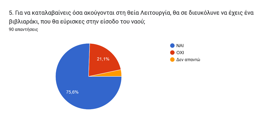 Σημαντικό θα ήταν επίσης για τους μαθητές (75,6% στο γράφημα 5) να υπήρχε ένα βιβλιαράκι στην είσοδο του Ναού, ώστε να γίνεται κατανοητά όσα ακούγονται στη Θεία Λειτουργία, την οποία ένα ποσοστό της τάξεως του 40% παρακολουθεί κάθε Κυριακή (γράφημα 2).