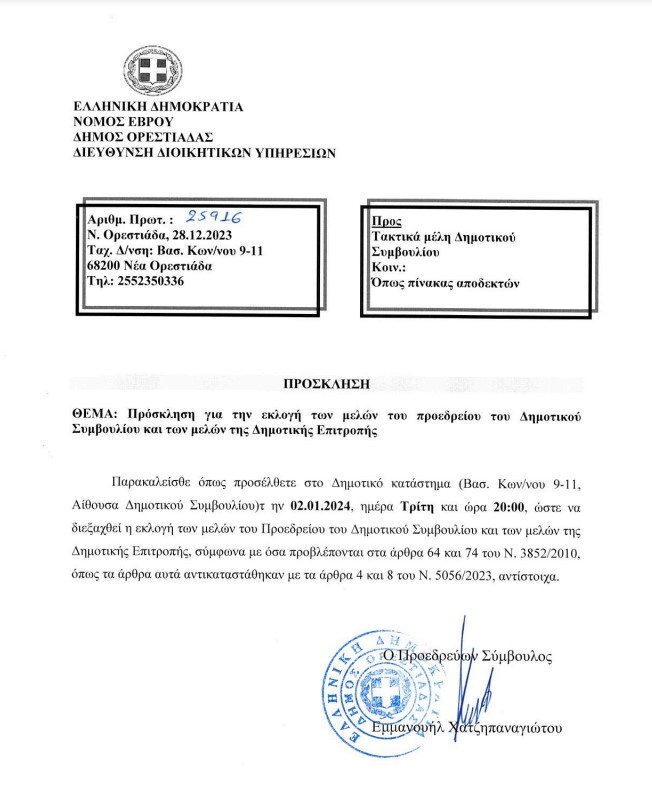 Η πρώτη συνεδρίαση του νέου Δημοτικού Συμβουλίου Ορεστιάδας θα πραγματοποιηθεί σήμερα Τρίτη 2 Ιανουαρίου 2024 και ώρα 20:00 στην αίθουσα του Δημοτικού Συμβουλίου