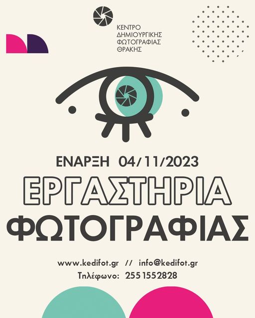 Το Κέντρο Δημιουργικής Φωτογραφίας Θράκης δίνοντας ιδιαίτερη έμφαση στην επιμόρφωση και την παροχή δυνατοτήτων δια βίου μάθησης στο ευρύ φάσμα της φωτογραφικής δημιουργίας, διοργανώνει εργαστήρια και masterclasses.