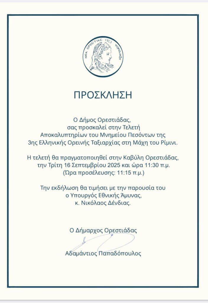 Στον Βόρειο Έβρο θα βρεθεί την Τρίτη 16 Σεπτεμβρίου ο Υπουργός Εθνικής Άμυνας, ο οποίος αναμένεται να επισκεφθεί τον Δήμο Ορεστιάδας και ειδικότερα την Καβύλη. Εκεί, στις 11:30 το πρωί, θα παραστεί στην τελετή αποκαλυπτηρίων του Μνημείου Πεσόντων της 3ης Ελληνικής Ταξιαρχίας, προς τιμήν των ηρώων που έδωσαν τη ζωή τους στη Μάχη του Ρίμινι.