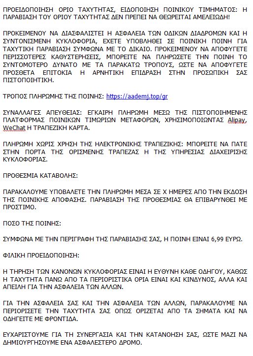 Με νέο μήνυμα SMS που αποστέλλεται σε κινητά τηλέφωνα, επιτήδειοι προσπαθούν να εξαπατήσουν τους πολίτες μέσω ψευδών ειδοποιήσεων περί δήθεν επιβολής «ποινής» ή «προστίμου» για υπέρβαση ορίου ταχύτητας.
