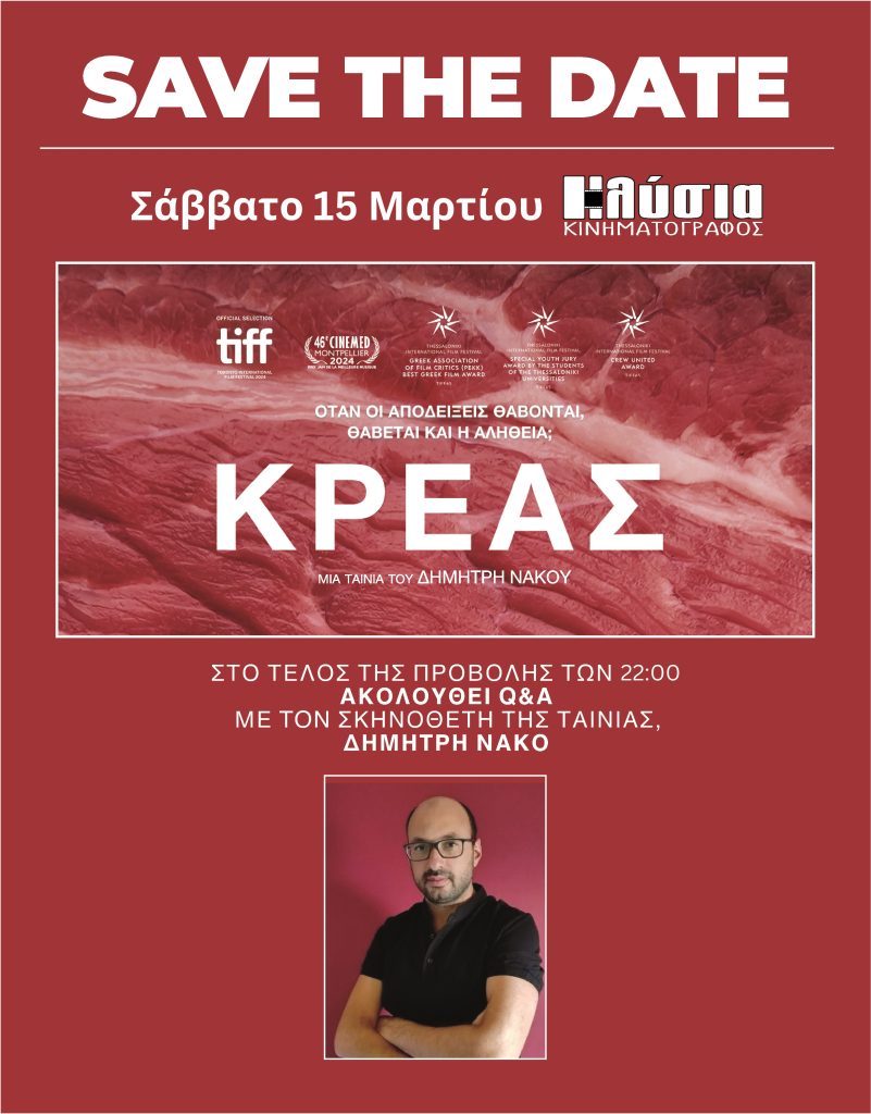 ΣΑΒΒΑΤΟ 15 ΜΑΡΤΙΟΥ ΣΤΙΣ 22.00 ΣΤΟΝ ΚΙΝΗΜΑΤΟΓΡΑΦΟ ΗΛΥΣΙΑ, Q&A μετά την προβολή της ταινίας ΚΡΕΑΣ με τον σκηνοθέτη Δημήτρη Νάκο