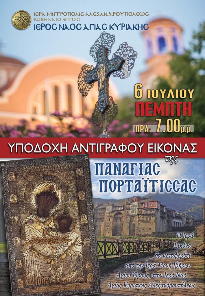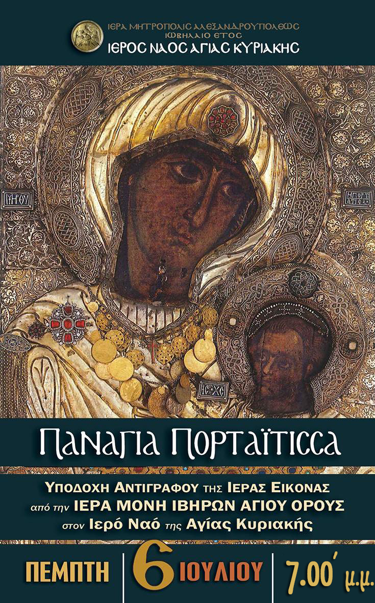 Την Πέμπτη 6 Ιουλίου στις 7.00’ το απόγευμα στον Ιερό Ναό της Αγίας Κυριακής θα έχουμε την ιδιαίτερη ευλογία να υποδεχθούμε ακριβές αντίγραφο της ιεράς εικόνος της Παναγίας Πορταΐτισσας που φυλάσσεται στην Ιερά Μονή των Ιβήρων του Αγίου Όρους, η οποία θα θησαυρισθεί σε ειδικό χώρο στον Ιερό Ναό.