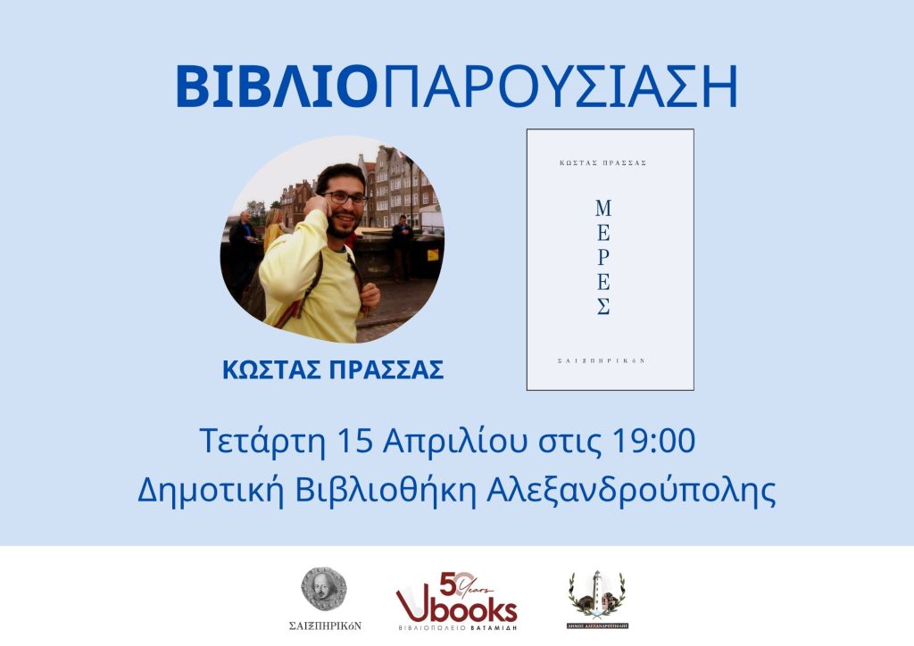 Το βιβλιοπωλείο Βαταμίδη vbooks.gr και οι εκδόσεις Σαιξπηρικόν σας προσκαλούν στη Δημοτική Βιβλιοθήκη ΑΛεξανδρούπολης για την παρουσίαση της νέας συλλογής διηγημάτων του Κώστα Πρασσά: “Μέρες”