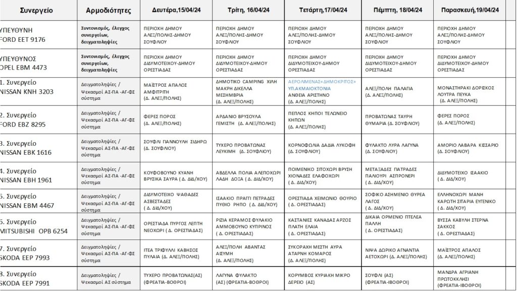 Ακολουθεί ο πίνακας αρμοδιοτήτων, ανά περιοχή και ημέρα