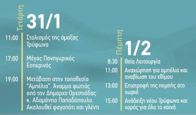 15:00 Ανάδειξη νέου Τρύφωνα και χορός για όλο το κοινό