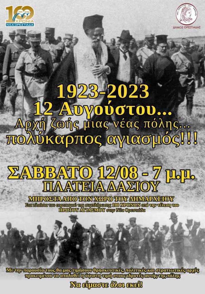 Στα πλαίσια του Εορτασμού της συμπλήρωσης 100 χρόνων από την τέλεση του πρώτου Αγιασμού στην Νέα Ορεστιάδα, ο Δήμος Ορεστιάδας και η Επιτροπή 100 χρόων, σας προσκαλούν να παρευρεθείτε το Σάββατο 12 Αυγούστου και ώρα 19:00 στον Αγιασμό που θα τελεστεί στην Κεντρική πλατεία, προκειμένου να αποδοθεί η ύψιστη τιμή στους ιδρυτές της Νέας Ορεστιάδας, εγκαινιάζονας την νέα 100ετία για την πόλη μας