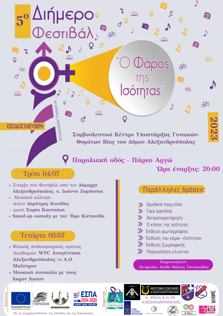 Στο πλαίσιο της προσπάθειας για την υπέρβαση κάθε μορφής έμφυλων ανισοτήτων, το Συμβουλευτικό Κέντρο Υποστήριξης Γυναικών-Θυμάτων Βίας του Δήμου Αλεξανδρούπολης διοργανώνει το 5ο διήμερο Φεστιβάλ «Ο Φάρος της Ισότητας» με ελεύθερη είσοδο για όλους και όλες στις 04 & 05 Ιουλίου 2023, με ώρα έναρξης 20:00, στην παραλιακή οδό της Αλεξανδρούπολης (στο ύψος του Πάρκου «Αργώ» – απέναντι από την 12η Μεραρχία Πεζικού).