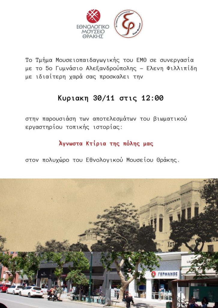 Το 5ο Γυμνάσιο Αλεξανδρούπολης – Ελένη Φιλιππίδη σε συνεργασία με το Τμήμα Μουσειοπαιδαγωγικής του Εθνολογικού Μουσείου Θράκης κατά το σχολικό έτος 2024-25 πραγματοποίησε δράση – βιωματικό εργαστήριο τοπικής ιστορίας με θέμα “Άγνωστα Κτίρια της πόλης μας”.