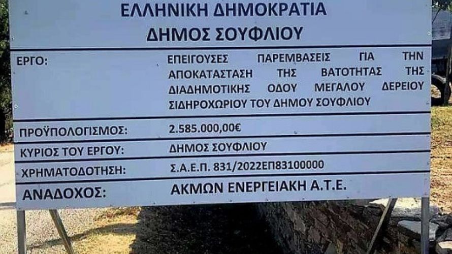 Σύμβαση για την αποκατάσταση της διαδημοτικής οδού Σιδηροχωρίου- Μεγάλου Δερείου, υπέγραψε ο δήμαρχος Σουφλίου με την ανάδοχο εταιρεία «ΑΚΜΩΝ ΕΝΕΡΓΕΙΑΚΗ ΑΝΩΝΥΜΗ ΤΕΧΝΙΚΗ ΕΤΑΙΡΙΑ» και δ.τ. «ΑΚΜΩΝ Α.Τ.Ε.».