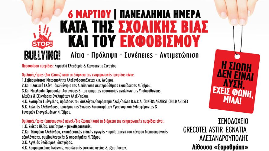 Η 6η Μαρτίου έχει καθιερωθεί επίσημα από το Υπουργείο Παιδείας ως Πανελλήνια Ημέρα κατά της σχολικής βίας και του εκφοβισμού…